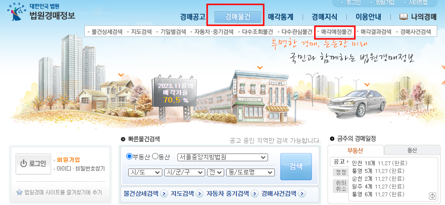 대한민국 법원 법원경매정보 사이트입니다. 홈페이지에 접속하시면 메인화면 상단 메뉴 경매물건에서 매각예정물건을 눌러줍니다.