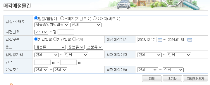 법원 또는 소재지를 설정하여 검색을 누르면 법원별, 지역별 올라온 경매 예정 물건들을 확인할 수 있습니다.