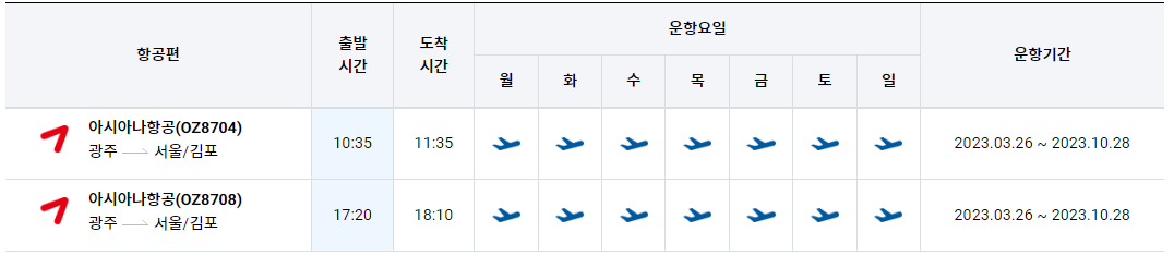 광주공항에서 김포공항 시간표