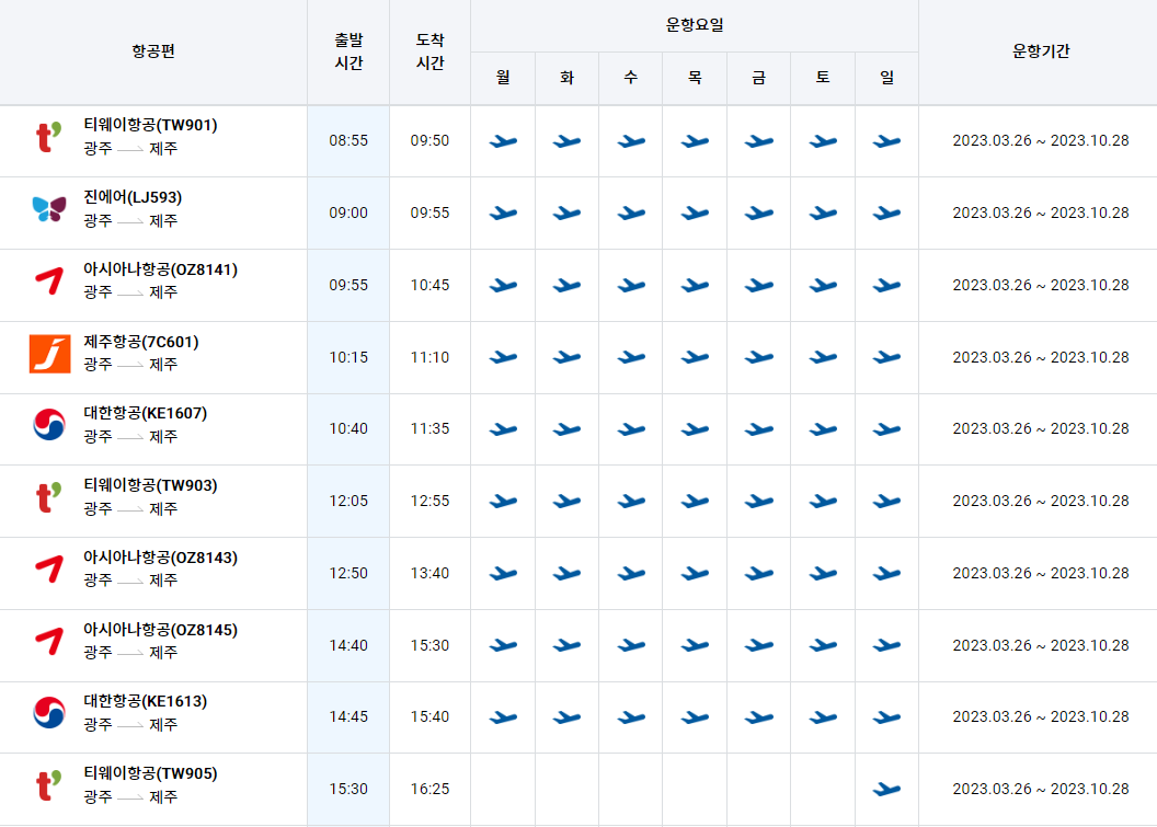 광주공항에서 제주도공항 시간표를 알아보겠습니다. 한국공항공사에서 제공하는 운항스케쥴입니다. 출발시간과 도착시간, 운항 요일 등을 확인할 수 있습니다.