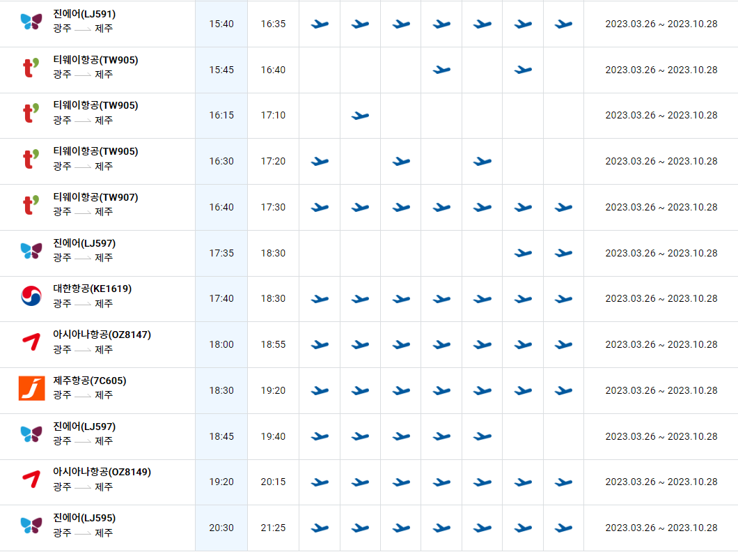 광주공항에서 제주도공항 시간표