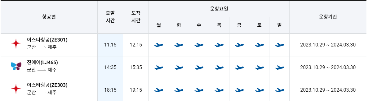 군산공항에서 제주도 항공권 시간표를 알아보겠습니다. 김포국제공항에서 제공하는 항공편 운항스케쥴입니다. 출발시간과 운항 요일, 편명 등을 확인할 수 있습니다.