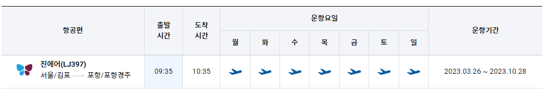 김포공항에서 포항공항 가는 비행기 시간표를 알아보겠습니다. 한국공항공사에서 제공하는 운항스케쥴입니다. 출발시간과 도착시간, 운항 요일 등을 확인할 수 있습니다.