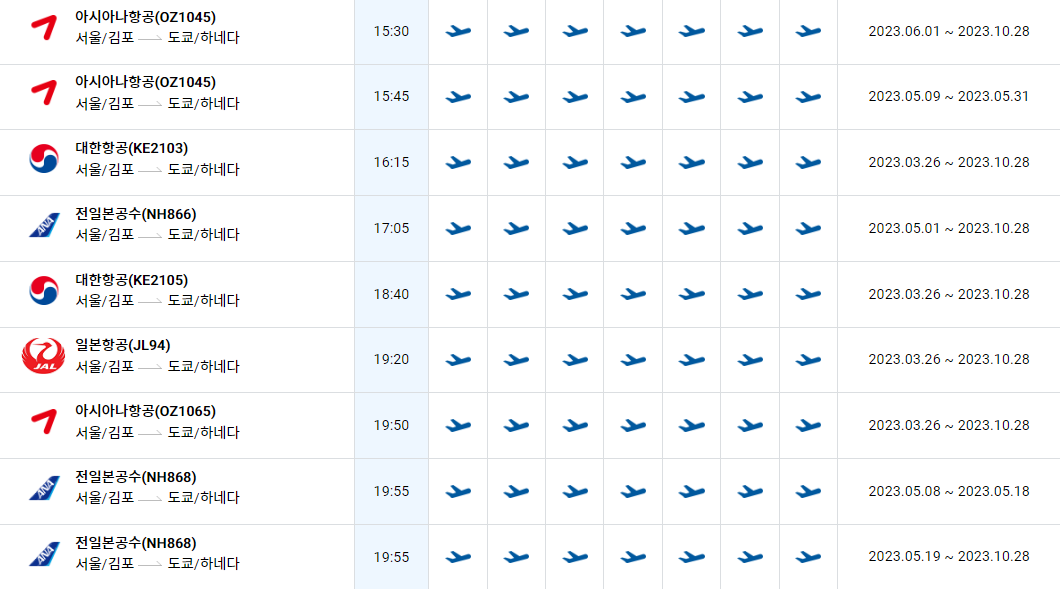 김포 하네다 노선 운항시간 비행기 시간표를 알아보겠습니다. 한국공항공사에서 제공하는 항공편 운항스케쥴입니다. 출발시간과 도착시간, 운항 요일 등을 확인할 수 있습니다.