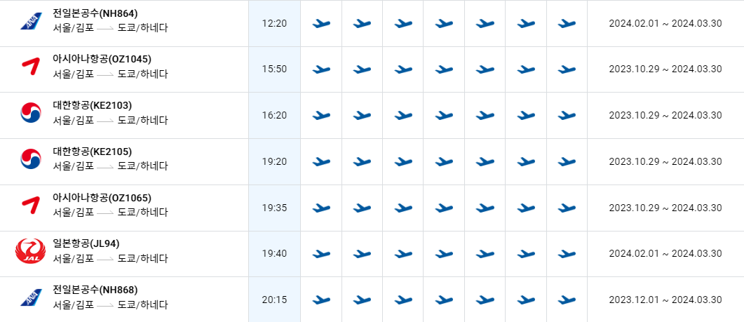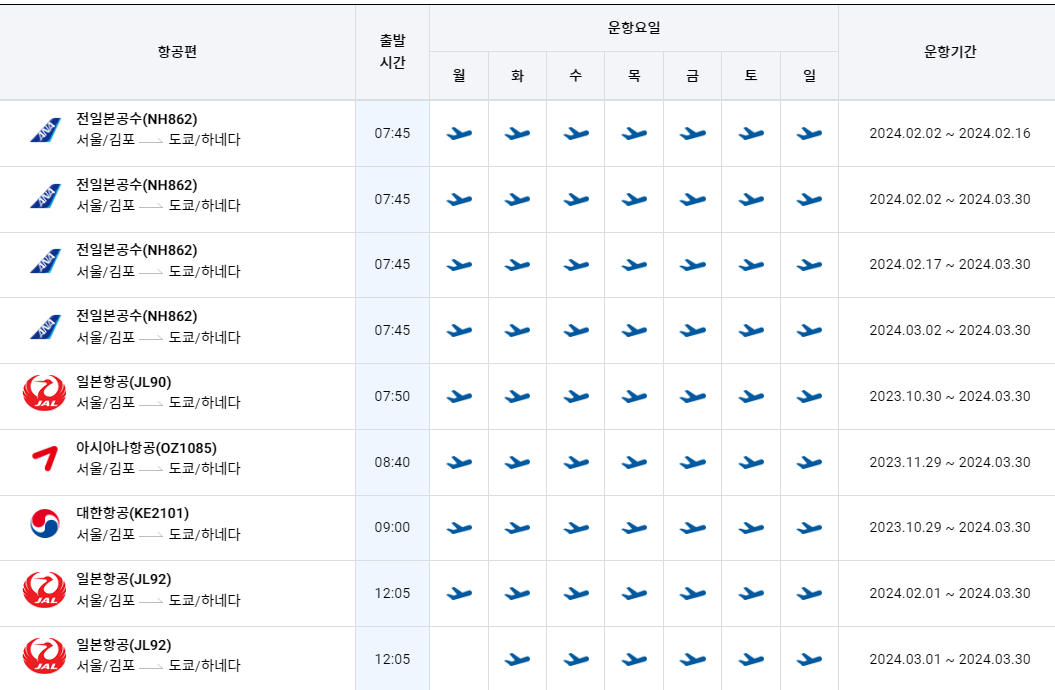 김포 하네다 노선 운항시간 비행기 시간표를 알아보겠습니다. 김포국제공항에서 제공하는 항공편 운항스케쥴입니다. 출발시간과 운항 요일, 편명 등을 확인할 수 있습니다.