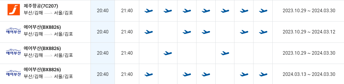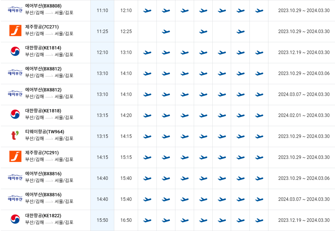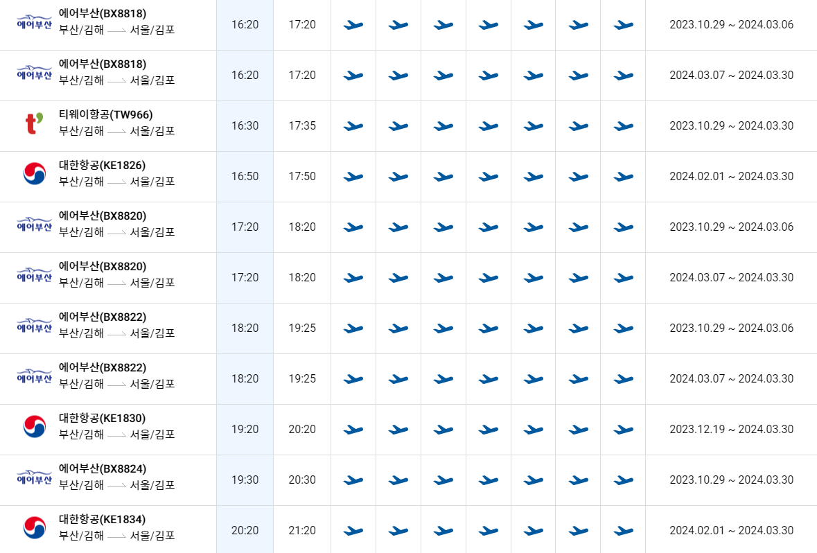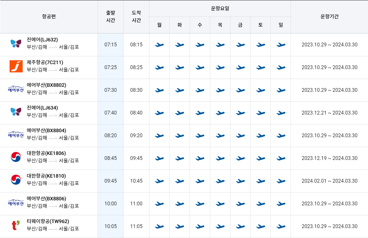 김해공항에서 김포공항 비행기 시간표
