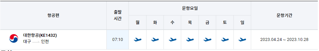 대구에서 인천공항 비행기 시간표를 알아보겠습니다. 한국공항공사에서 제공하는 항공편 운항스케쥴입니다. 출발시간과 운항 요일 등을 확인할 수 있습니다.