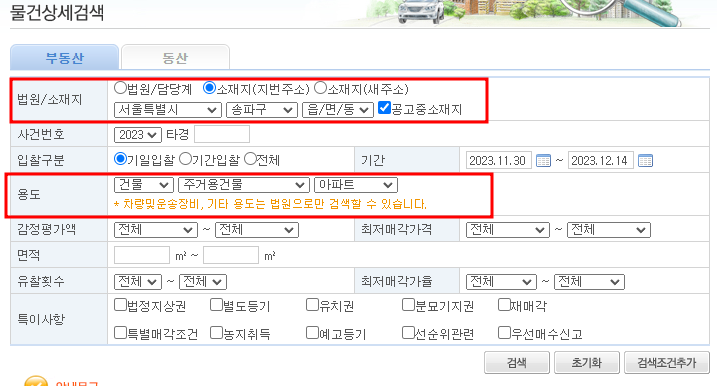 소재지를 눌러주시고 원하시는 지역을 설정 후 용도를 건물 - 주거용건물 - 아파트로 설정해주신다음 검색을 누릅니다.
