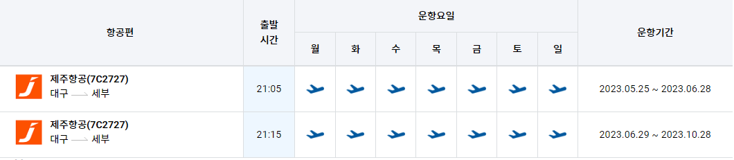대구 세부 노선 비행기 시간표를 알아보겠습니다. 한국공항공사에서 제공하는 항공편 운항스케쥴입니다. 출발시간과 운항 요일 등을 확인할 수 있습니다.