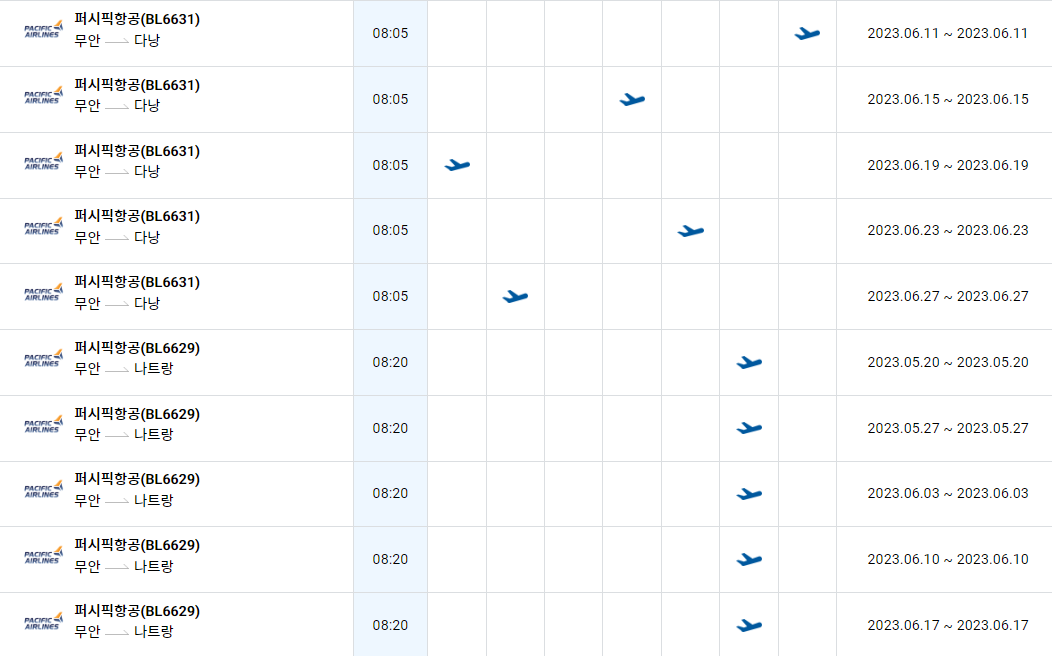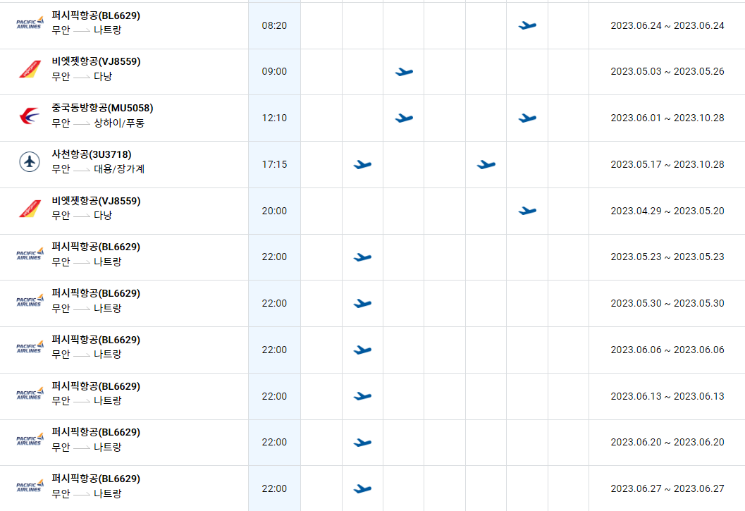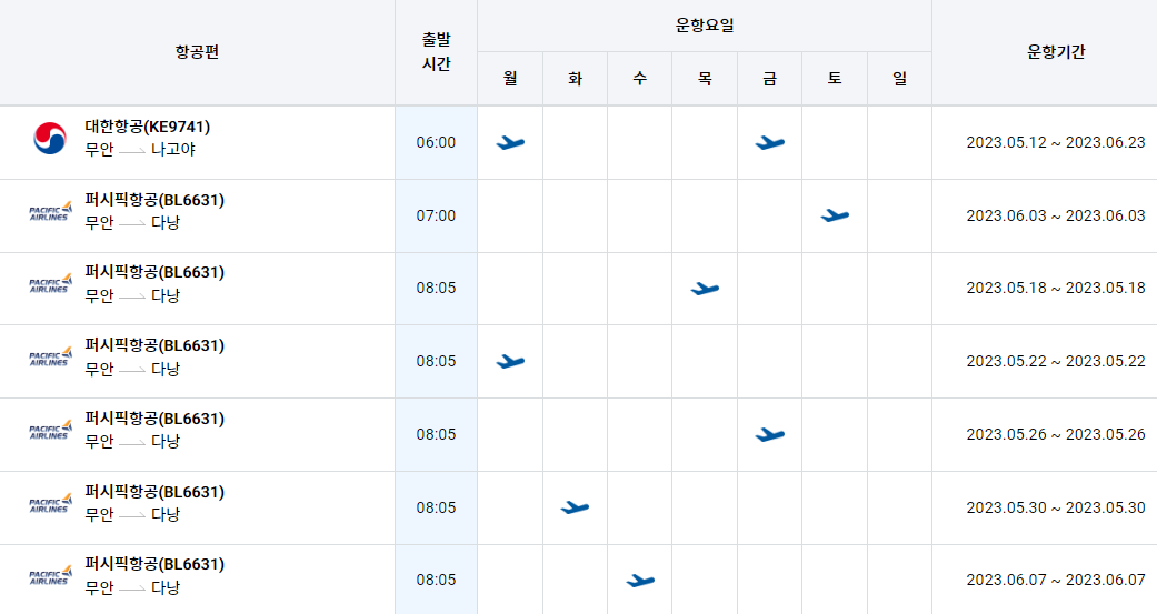 무안공항 국제선 노선 비행기 시간표를 알아보겠습니다. 한국공항공사에서 제공하는 항공편 운항스케쥴입니다. 출발시간과 도착시간, 운항 요일 등을 확인할 수 있습니다.