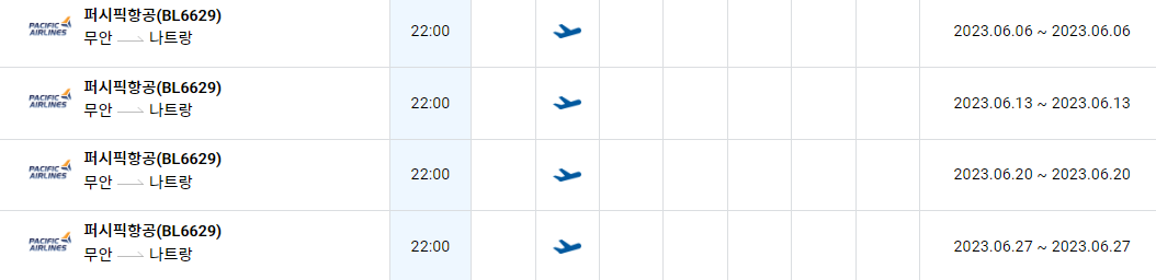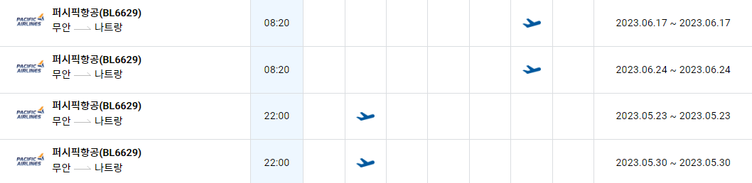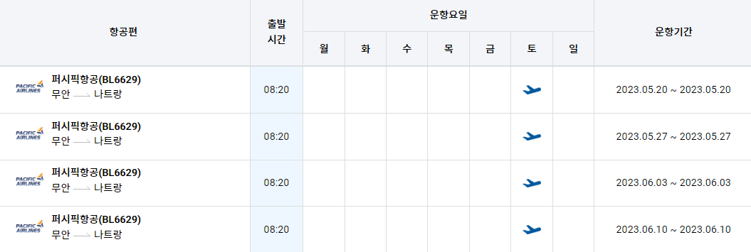 무안 나트랑 항공편 비행기 시간표를 알아보겠습니다. 한국공항공사에서 제공하는 항공편 운항스케쥴입니다. 출발시간과 도착시간, 운항 요일 등을 확인할 수 있습니다.
