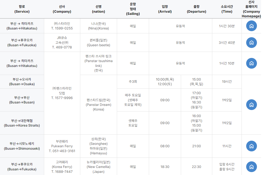 위 바로가기를 통해서 각 항로에 선사, 연락처, 소요시간 등을 알 수 있습니다. 해당 페이지에 가셔서 우측에 홈 버튼을 이용하시면 선사홈페이지에서 표 예약 가격 조회를 할 수 있습니다. 궁금한 사항이 있으시다면 해당 선사에 전화하셔서 문의 하시기 바랍니다. 혼자 여행 계획하기 힘드신분들은 여행사에서 운영하는 여행 패키지를 이용해보시는 것도 좋습니다.