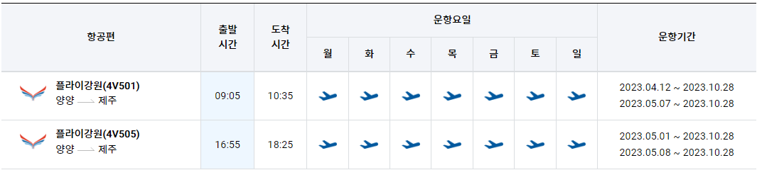 양양공항에서 제주공항 비행기 시간표를 알아보겠습니다. 한국공항공사에서 제공하는 항공편 운항스케쥴입니다. 출발시간과 도착시간, 운항 요일 등을 확인할 수 있습니다.