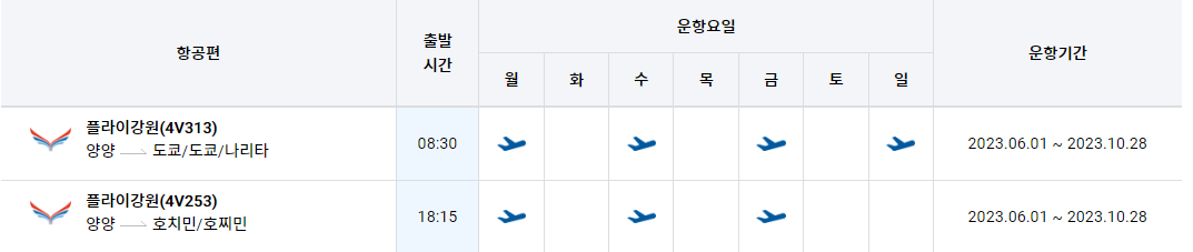 양양 국제공항 노선 비행기 시간표를 알아보겠습니다. 한국공항공사에서 제공하는 항공편 운항스케쥴입니다. 출발시간과 도착시간, 운항 요일 등을 확인할 수 있습니다.