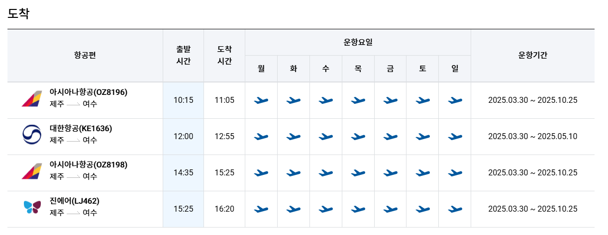 여수 제주항공 시간표 2025년