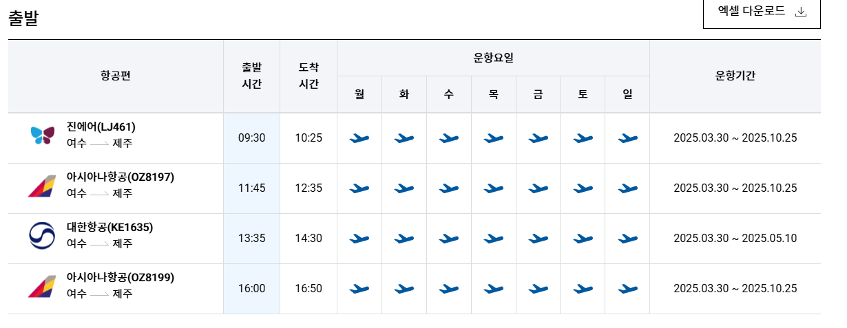 여수 제주항공 시간표 2025년를 알아보겠습니다. 인천공항에서 제공하는 항공편 운항스케쥴입니다. 출발시간과 운항 요일, 편명 등을 확인할 수 있습니다.