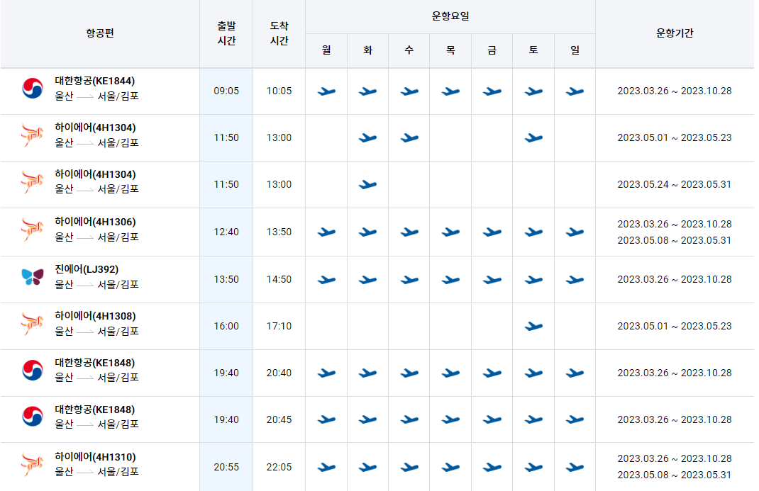 울산공항에서 김포공항 시간표를 알아보겠습니다. 한국공항공사에서 제공하는 운항스케쥴입니다. 출발시간과 도착시간, 운항 요일 등을 확인할 수 있습니다.