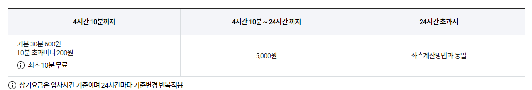 455대의 차량이 주차가 가능하고 24시간 운영하고 있습니다. 차량번호 인식으로 주차권 없이 입차하시면 되고 계산은 사전무인정산기 또는 출구 무인정산기를 이용하면 됩니다. 주차 요금을 보겠습니다.