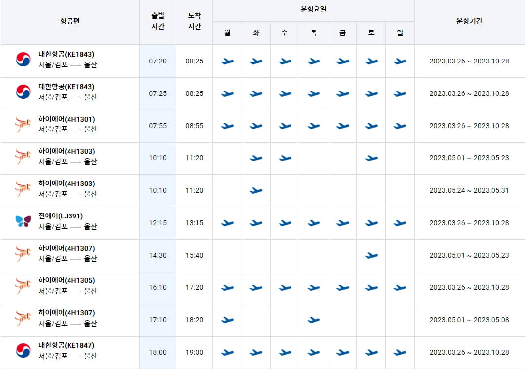 울산 김포 비행기 시간표
