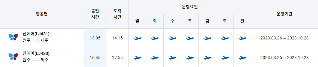 원주 제주간 항공 시간표를 알아보겠습니다. 한국공항공사에서 제공하는 항공편 운항스케쥴입니다. 출발시간과 도착시간, 운항 요일 등을 확인할 수 있습니다.