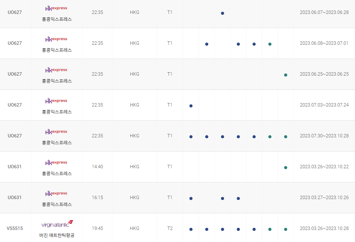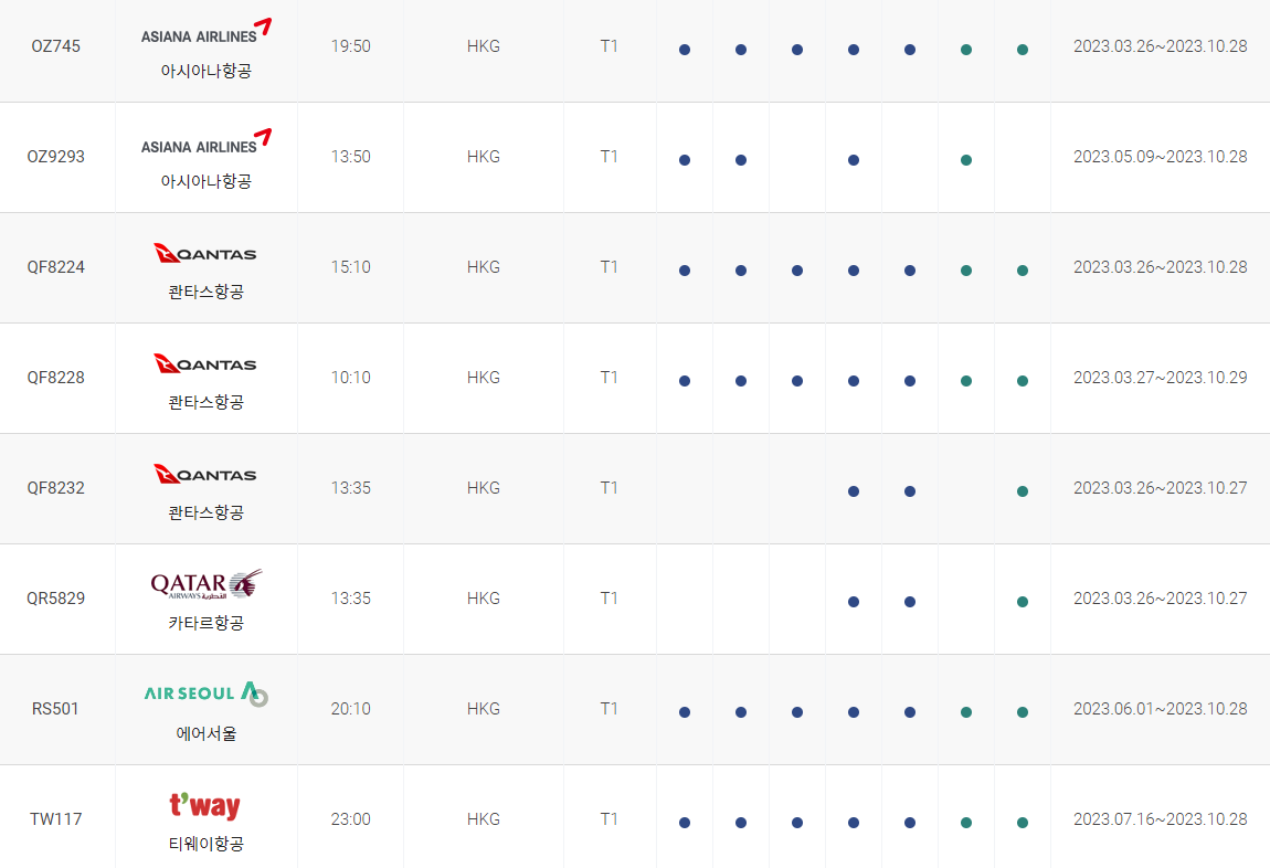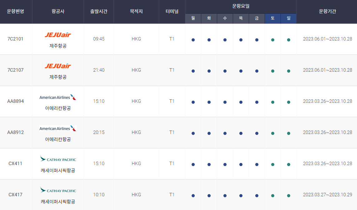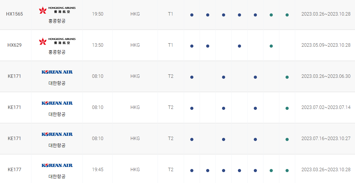 인천에서 홍콩까지 비행시간 비행기 시간표를 알아보겠습니다. 인천국제공항에서 제공하는 항공편 운항스케쥴입니다. 출발시간과 운항 요일, 편명 등을 확인할 수 있습니다.