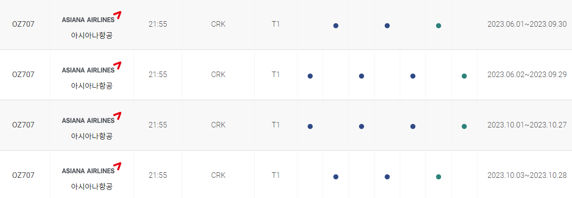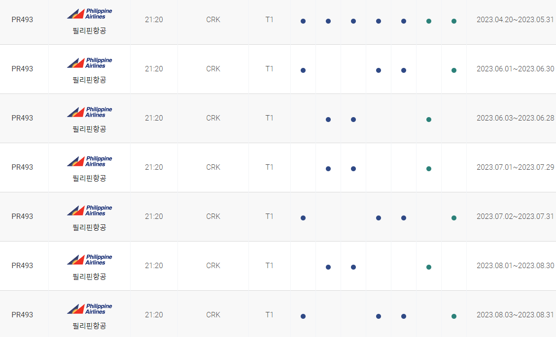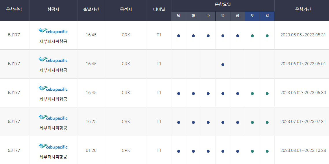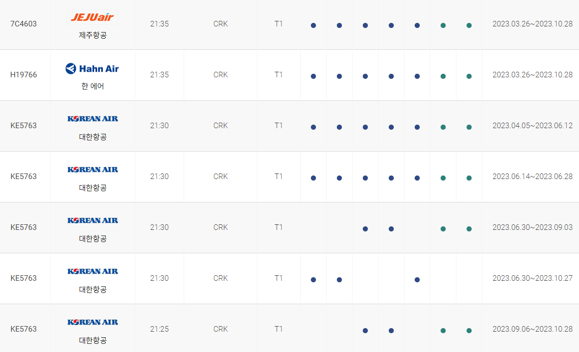 인천 클라크필드 비행시간 비행기 시간표를 알아보겠습니다. 인천국제공항에서 제공하는 항공편 운항스케쥴입니다. 출발시간과 운항 요일, 편명 등을 확인할 수 있습니다.