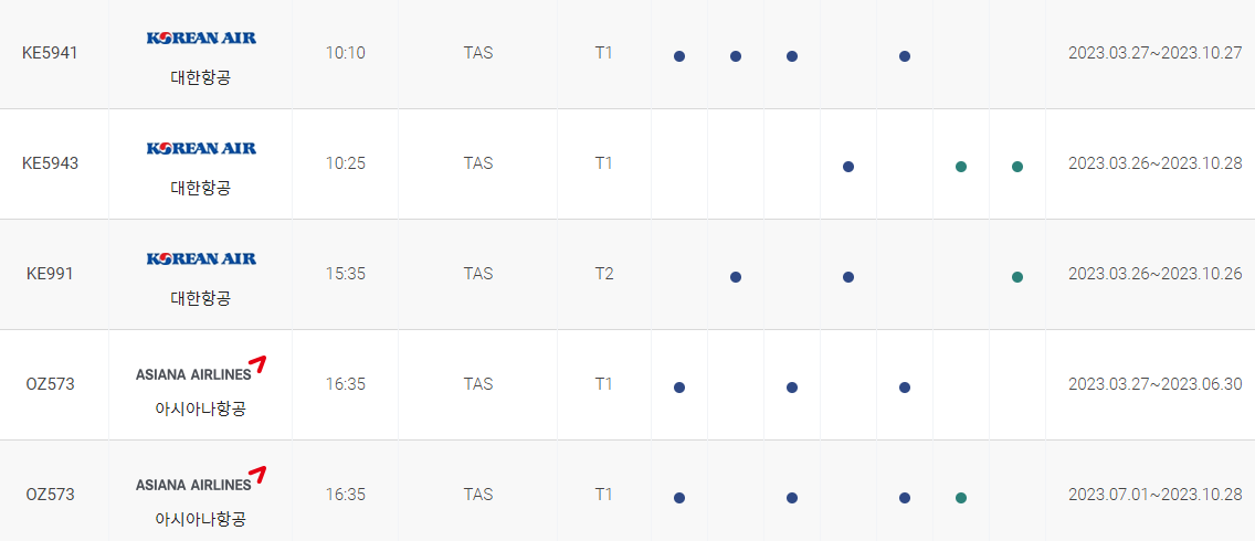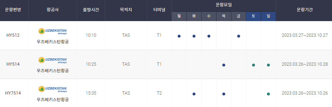 인천 타슈켄트 비행시간 비행기 시간표를 알아보겠습니다. 인천국제공항에서 제공하는 항공편 운항스케쥴입니다. 출발시간과 운항 요일, 편명 등을 확인할 수 있습니다.