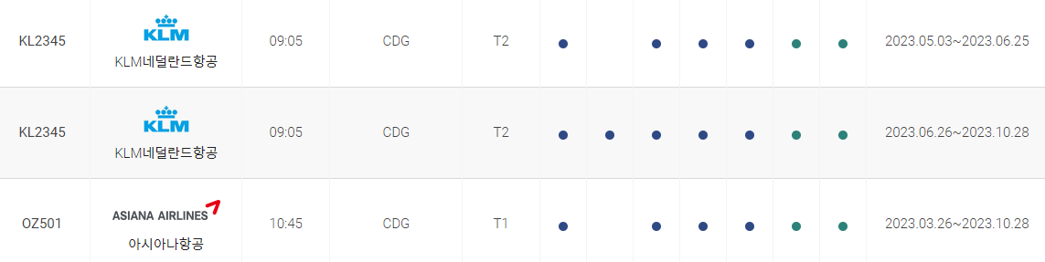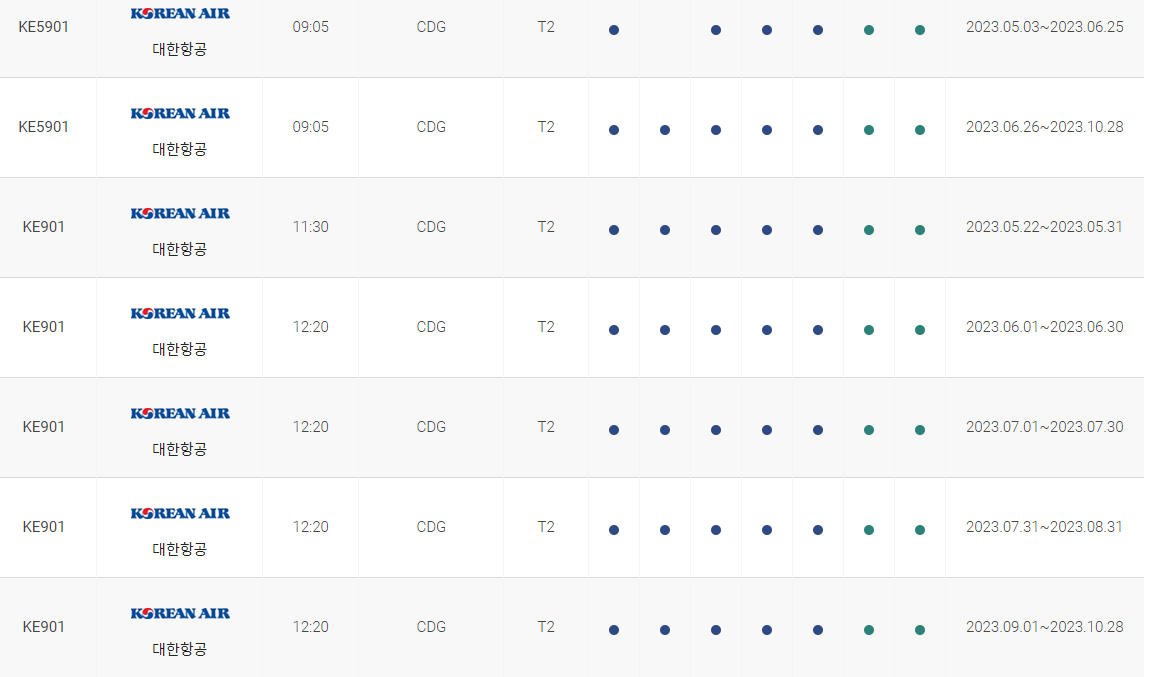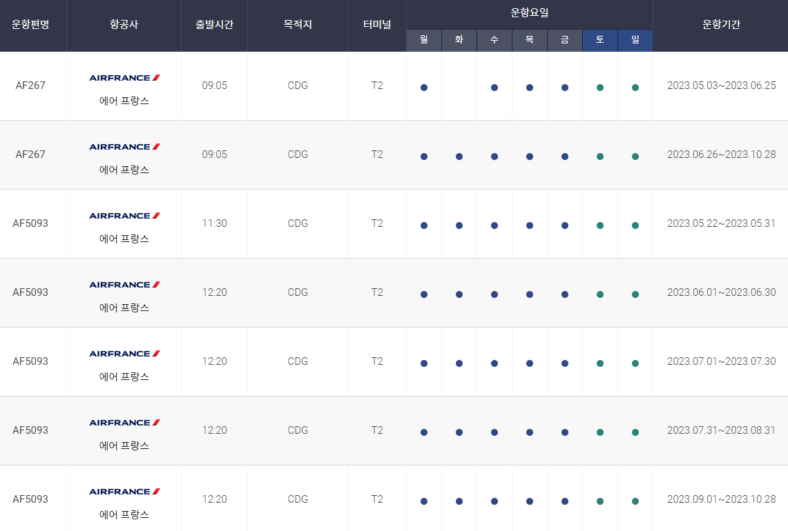 인천 파리 비행시간 비행기 시간표를 알아보겠습니다. 인천국제공항에서 제공하는 항공편 운항스케쥴입니다. 출발시간과 운항 요일, 편명 등을 확인할 수 있습니다.