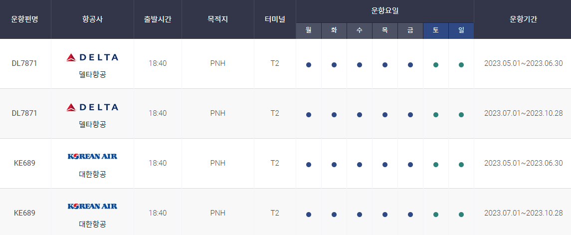 인천 프놈펜 비행시간 비행기 시간표를 알아보겠습니다. 인천국제공항에서 제공하는 항공편 운항스케쥴입니다. 출발시간과 운항 요일, 편명 등을 확인할 수 있습니다.