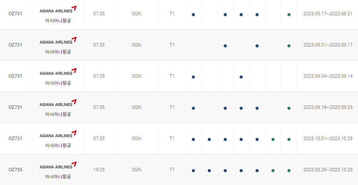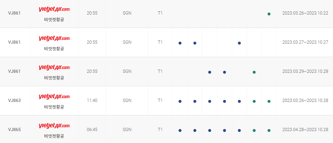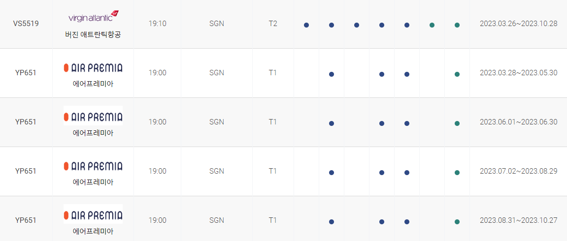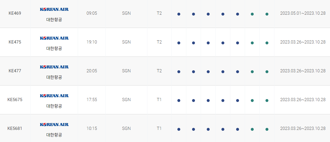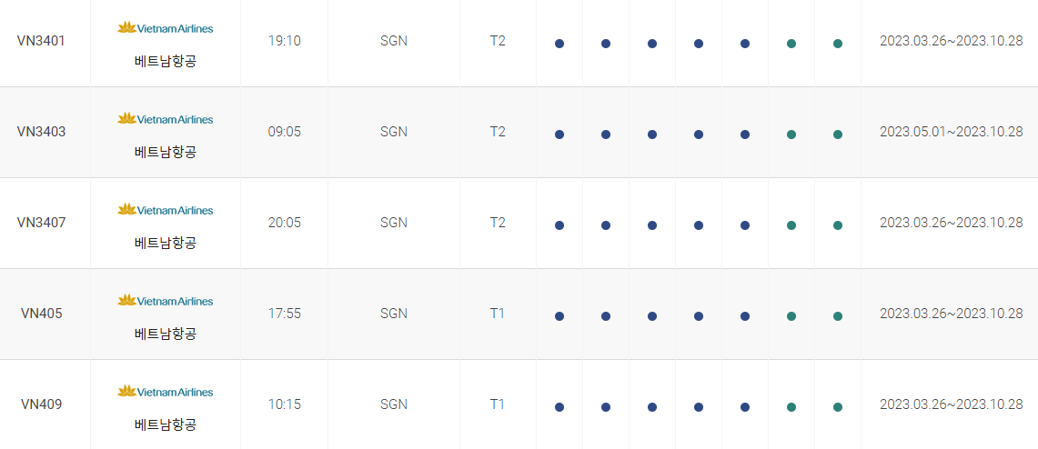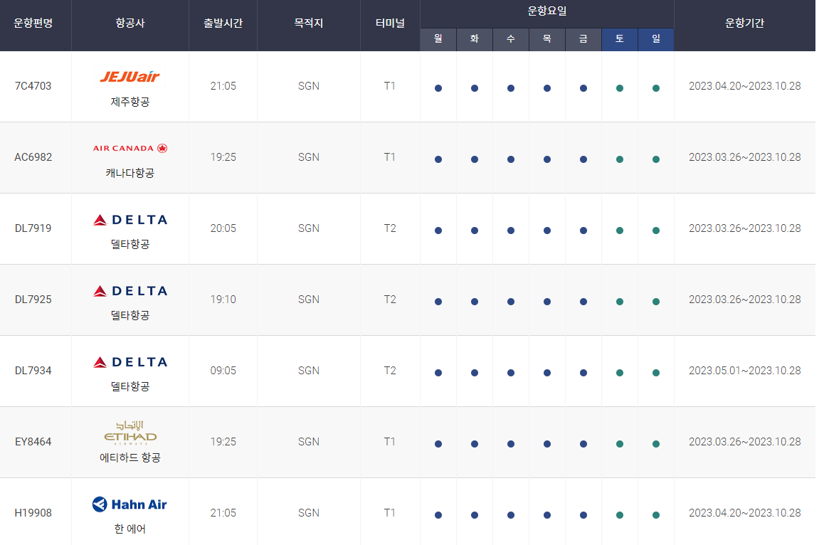 인천 호치민 비행시간 비행기 시간표를 알아보겠습니다. 인천국제공항에서 제공하는 항공편 운항스케쥴입니다. 출발시간과 운항 요일, 편명 등을 확인할 수 있습니다.