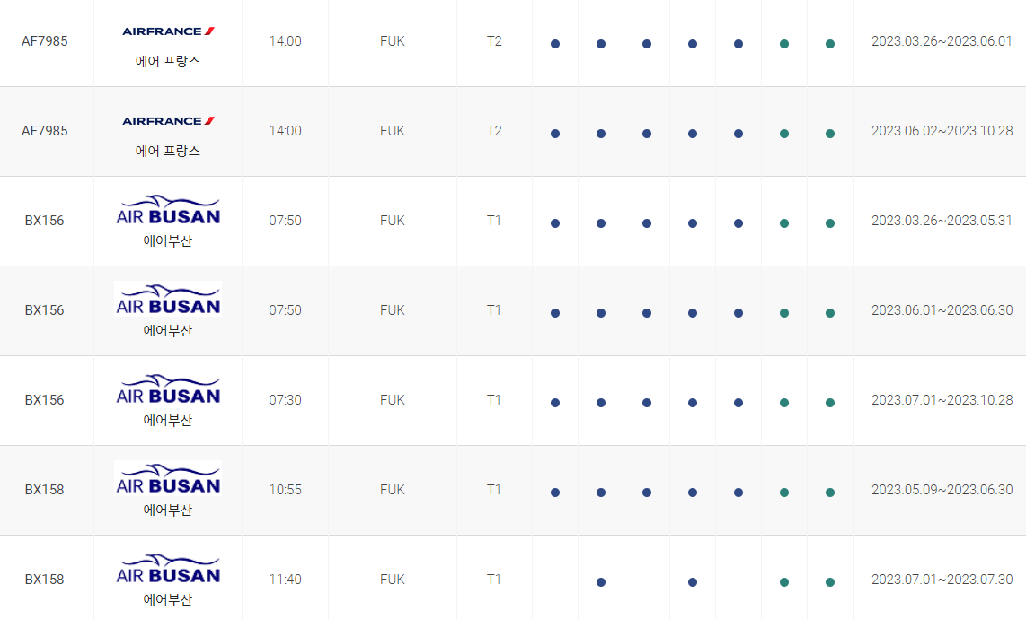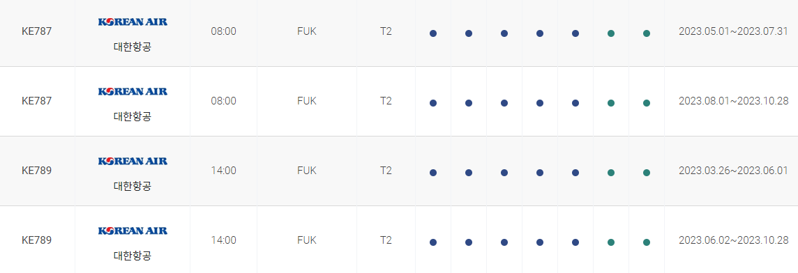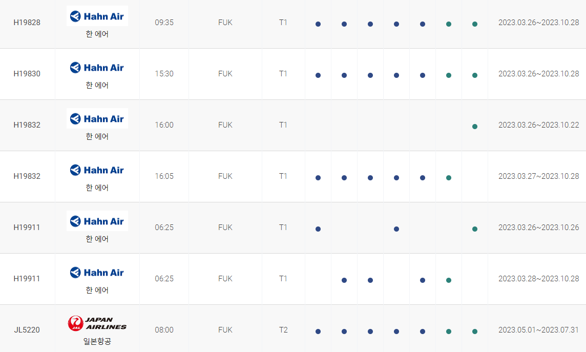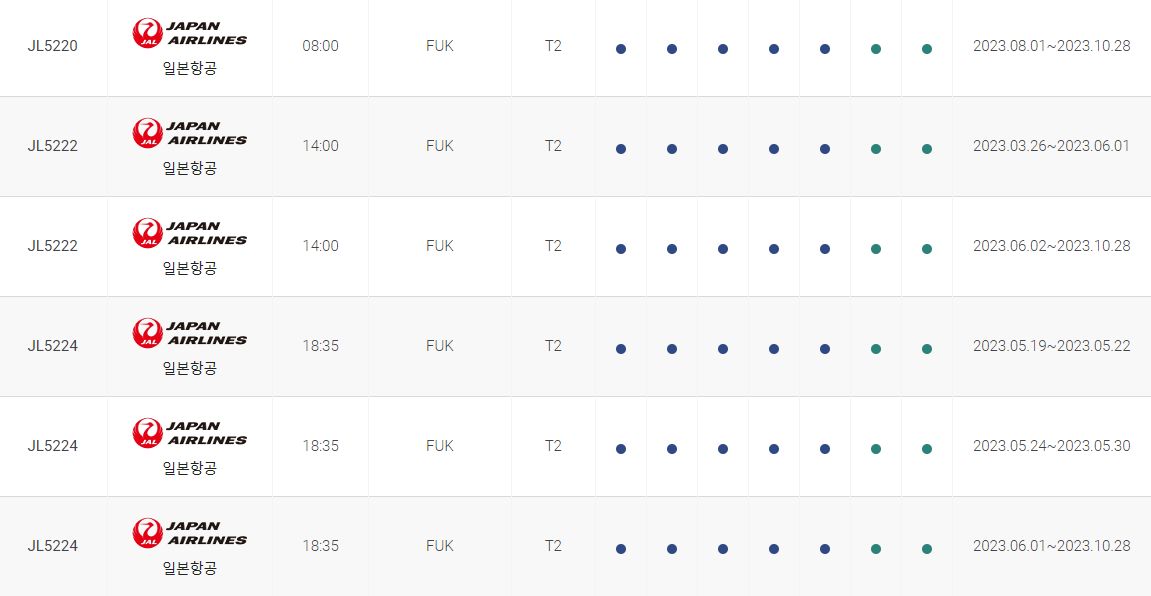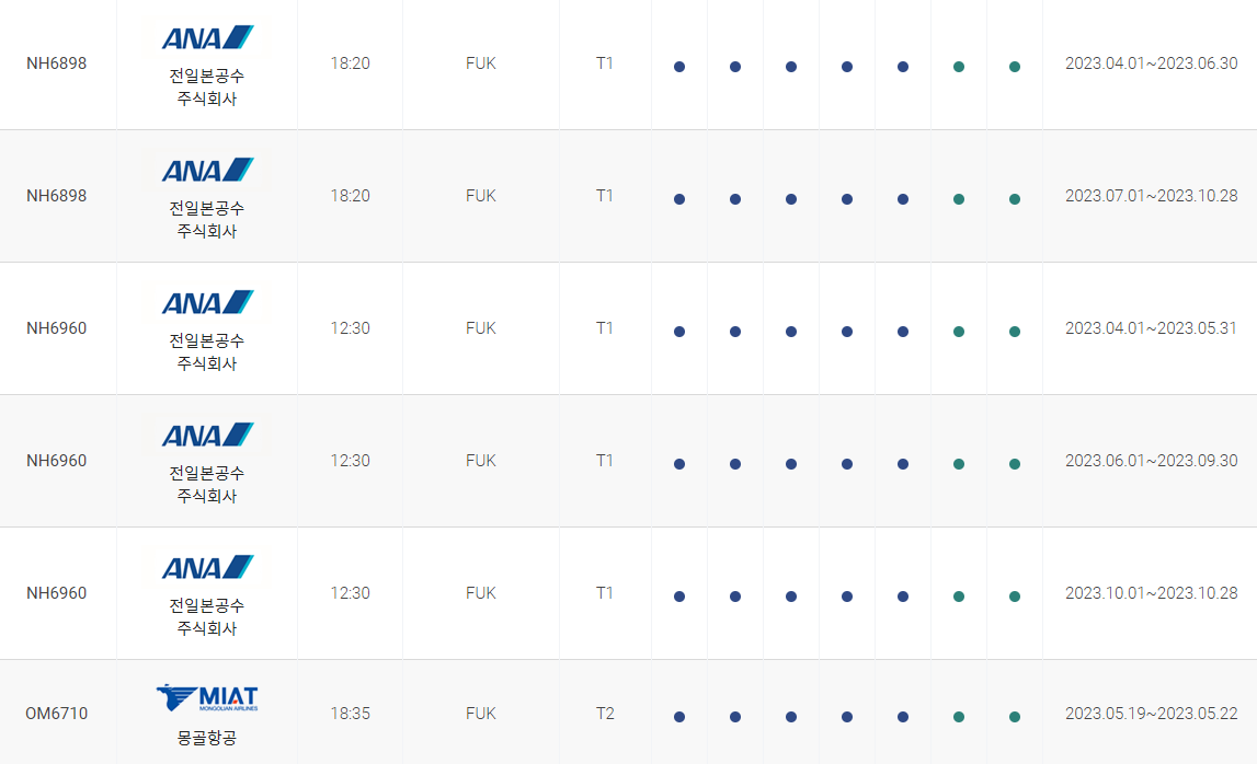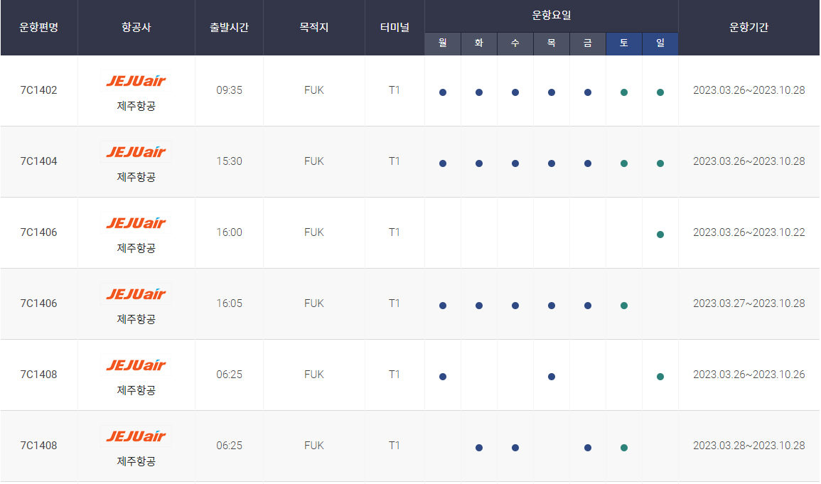 인천 후쿠오카 비행시간 비행기 시간표를 알아보겠습니다. 인천국제공항에서 제공하는 항공편 운항스케쥴입니다. 출발시간과 운항 요일, 편명 등을 확인할 수 있습니다.