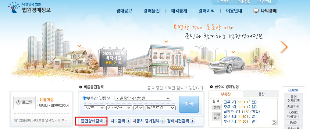 대한민국 법원 법원경매정보 사이트입니다. 홈페이지에 접속하시면 메인화면에 있는 물건상세검색을 눌러줍니다.