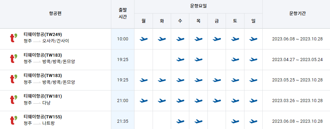 청주공항 국제선 노선 비행기 시간표를 알아보겠습니다. 한국공항공사에서 제공하는 항공편 운항스케쥴입니다. 출발시간, 운항 요일 등을 확인할 수 있습니다.