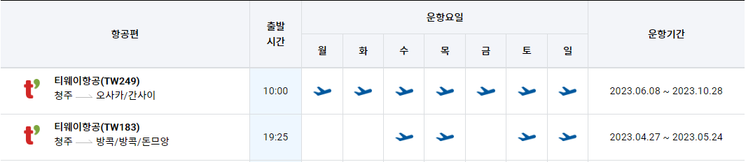 청주 국제공항 국제선운항정보 시간표를 알아보겠습니다. 한국공항공사에서 제공하는 항공편 운항스케쥴입니다. 출발시간과 도착시간, 운항 요일 등을 확인할 수 있습니다.