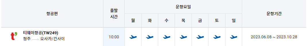 티웨이 청주 오사카 비행기 시간표를 알아보겠습니다. 한국공항공사에서 제공하는 항공편 운항스케쥴입니다. 출발시간과 도착시간, 운항 요일 등을 확인할 수 있습니다.