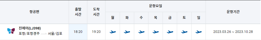 포항 김포 비행기 시간표를 알아보겠습니다. 한국공항공사에서 제공하는 운항스케쥴입니다. 출발시간과 도착시간, 운항 요일 등을 확인할 수 있습니다.