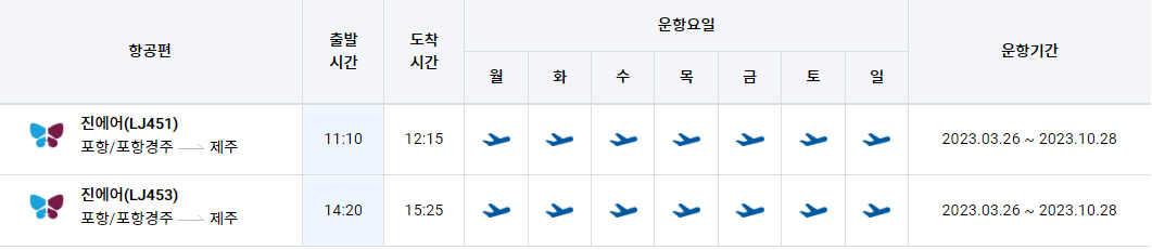 포항 제주 비행기 시간표