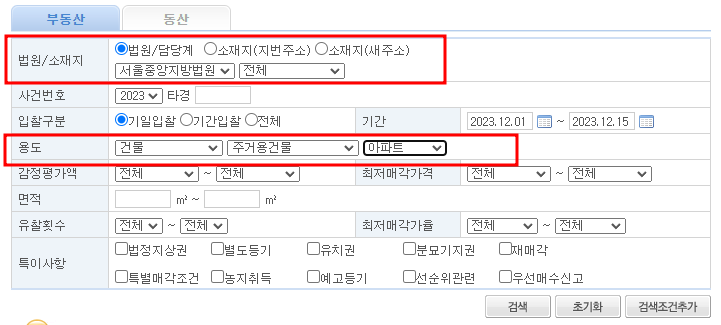 법원/소재지에서 원하시는 법원을 설정 후 아파트를 찾으신다면 용도를 건물 - 주거용건물 - 아파트로 설정해주신 다음 검색을 누릅니다.