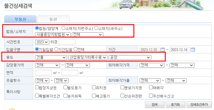 법원 또는 소재지를 설정해주고 용도에서 건물 - 산업용 및 기타특수용 - 공장으로 설정해주고 검색을 누릅니다.